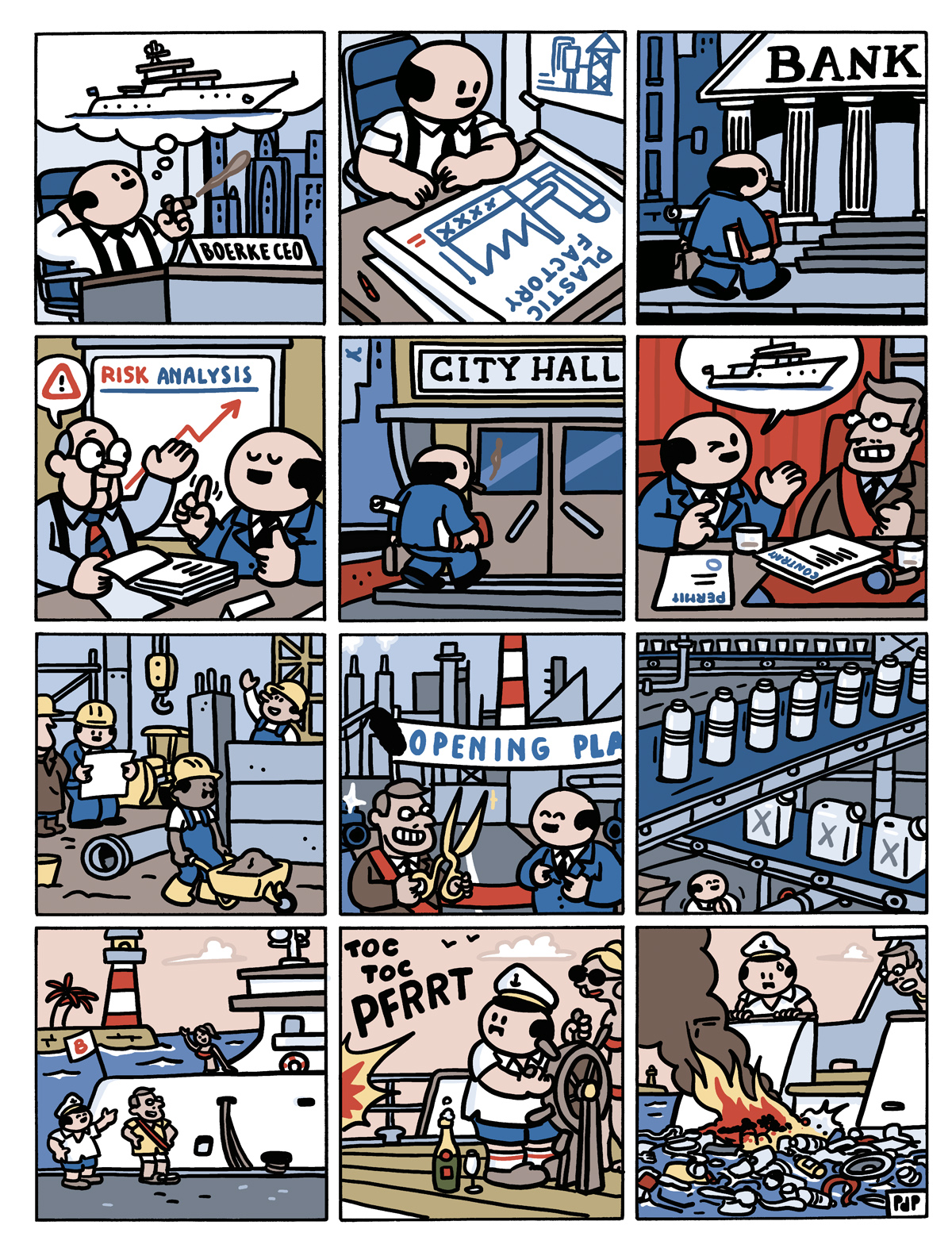 De Poortere’s 4 comic strips follow Boerke as he navigates the plastic pollution crisis, undertaking several roles and ventures that invariably go wrong for him. Whether it is by striking a disastrous deal with a plastics factory, making a high-risk investment in plastic production, or attempting to cut down on plastic packaging waste by misguided means, Boerke asks: how far will we take the absurd? And, most importantly: how do we break the absurdity cycle?