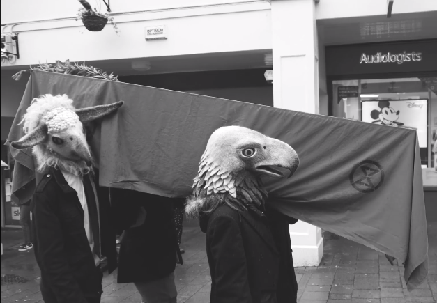 Last weekend Frome people took to the streets to bring awareness to the environmental emergency, by holding a symbolic funeral for extinct species. Approximately 200 people joined the procession from Rook Lane Chapel to the library, led by funeral director, Kevin Jones, and the Frome Street Bandits playing a mournful funeral march.  Symbolic pall bearers wearing felt animal masks made by local artist, Gladys Paulus, carried a coffin draped with the Extinction Rebellion logo. People came from as far away as Manchester and Birmingham to participate and bring awareness to the fact that we are in the sixth mass extinction and that 60% of wildlife species have been wiped off the earth since 1970 due to widespread use of pesticides, habitat destruction, mass deforestation and pollution to waterways.