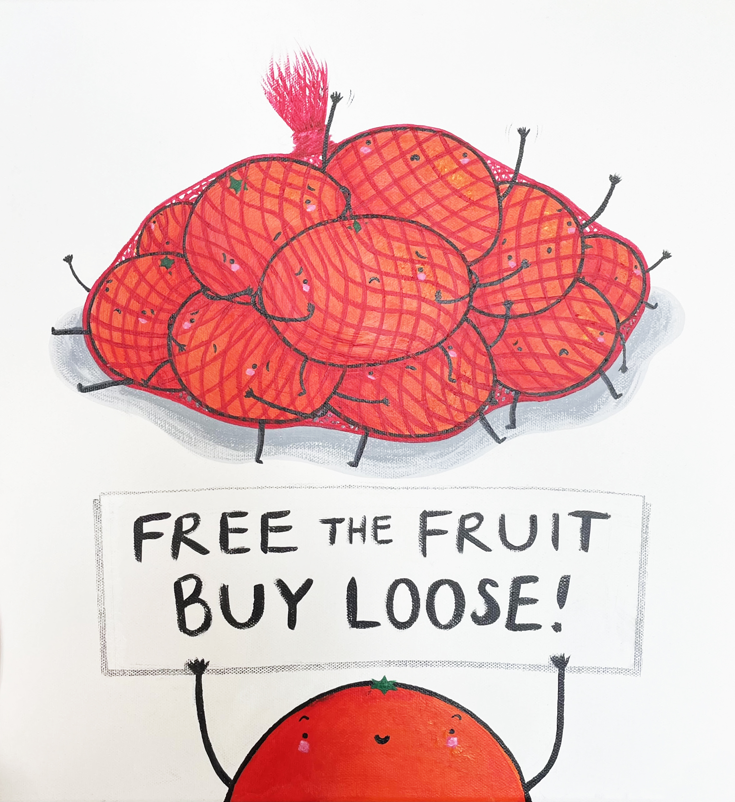 ‘I’m so happy to contribute a painting for #plasticfreejuly, which focuses specifically on the issue of plastic food packaging and the power we hold as consumers. When plastic is used for food packaging, it becomes an undervalued, disposable material; one that is used and thrown away sometimes within minutes. And yet, plastic lasts forever, slowly breaking down into toxic microplastics that permeate our ecosystems. With my painting, I hope to highlight this mismatch, whilst appealing to our immense capacity for empathy. Free the fruit!’ – Ellise Chappell, Actress
