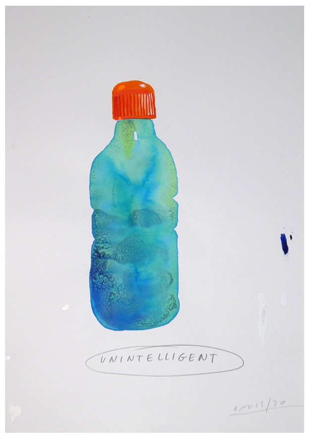 Using seawater, ink and watercolour, Davis paints a variety of widely used water-bottles, adding insults (to injury, as it were) to raise awareness around the urgency with which the worlds plastic addiction needs to be broken, “It takes 3 litres of water to manufacture a 1 litre plastic bottle of water. This is crazy. Lets stop buying plastic water bottles and buy reusable ones instead,” decries Paul Davis, Artist.