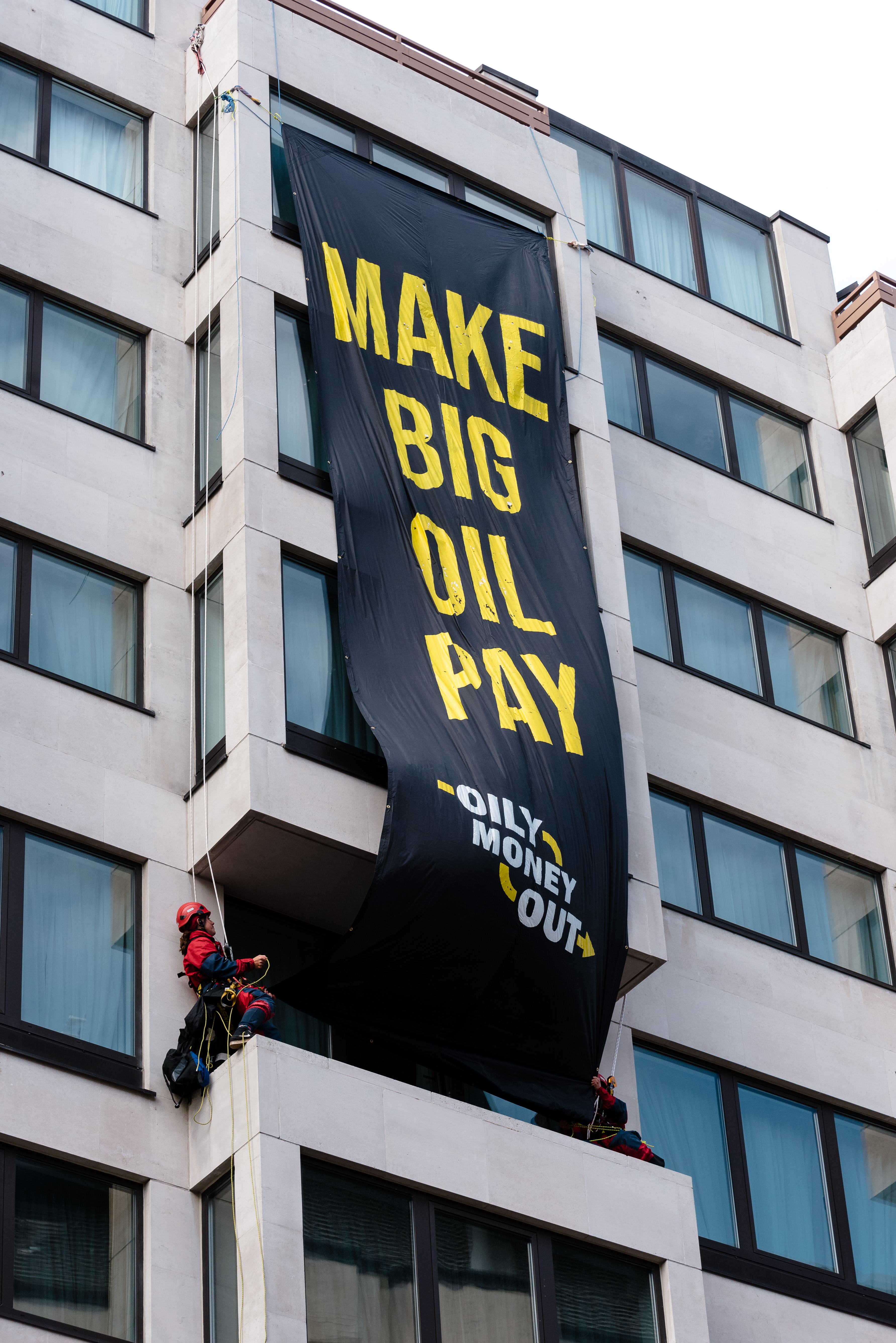Greenpeace climbers suddenly began to abseil down the building from a seemingly pre-booked hotel balcony, dropping a massive banner declaring ‘Make Big Oil Pay - Oily Money Out’.