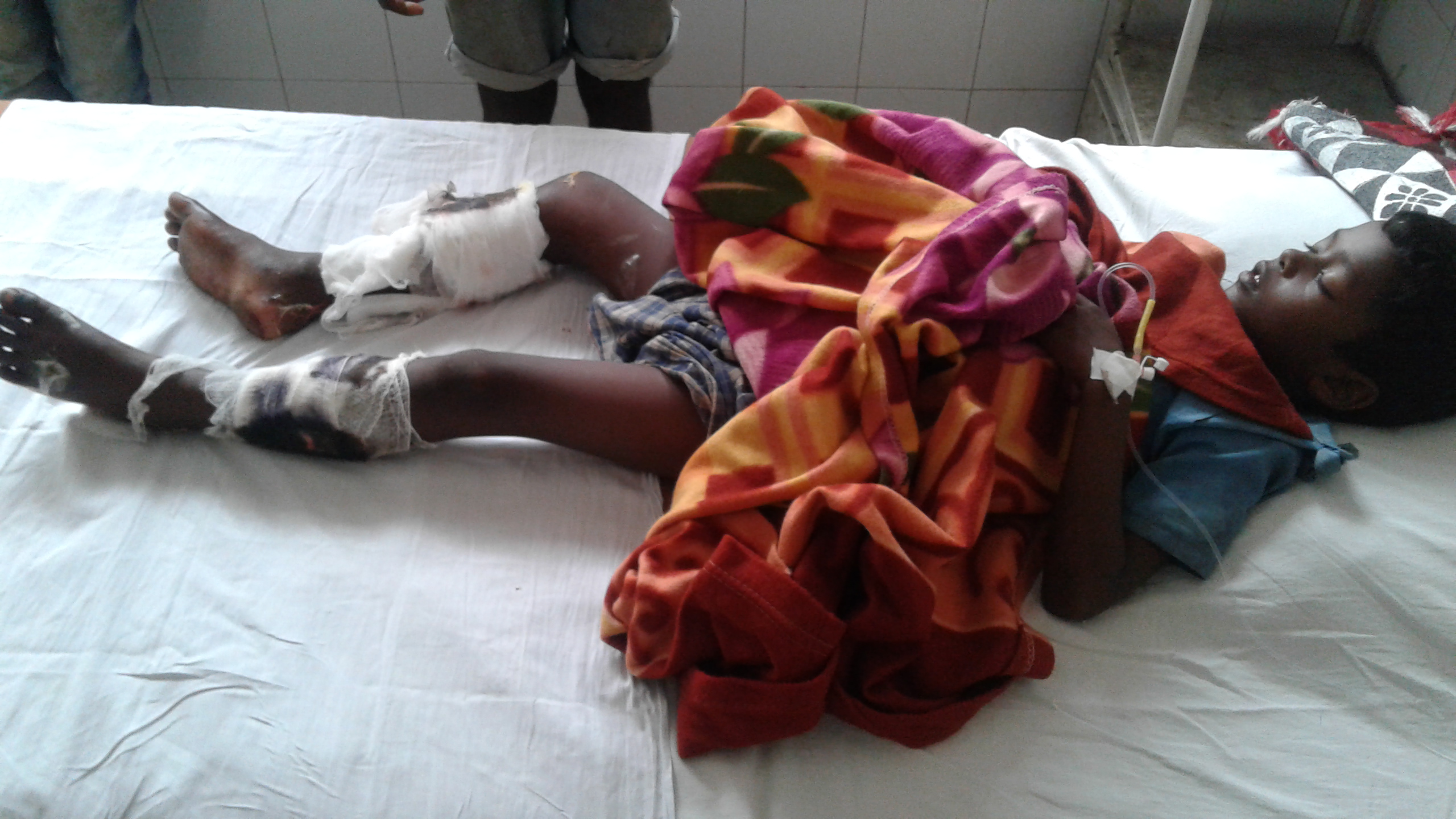 Akash Orang, a seven year old tribal boy, was maimed for life after being shot by a guard in Kaziranga National Park. The park has a shoot on sight policy. © Survival
