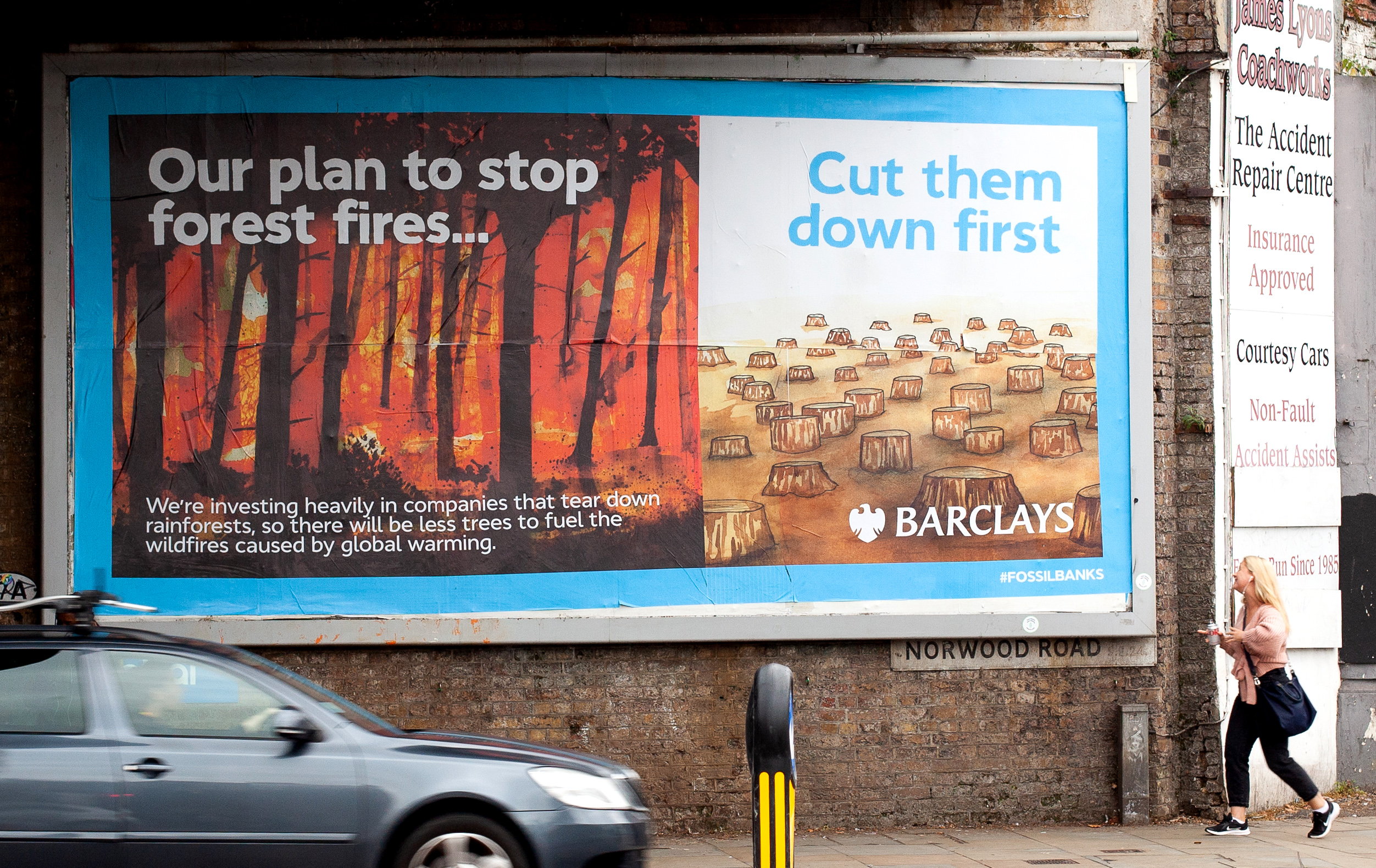 “The posters showcase the environmental impacts we don’t see in Barclays’ own adverts: the deforestation, the ocean drilling, the oil spills, the wildfires, the threat to wildlife. They’re a corrective, right of reply to the greenwash messaging of Europe’s dirtiest bank.”
