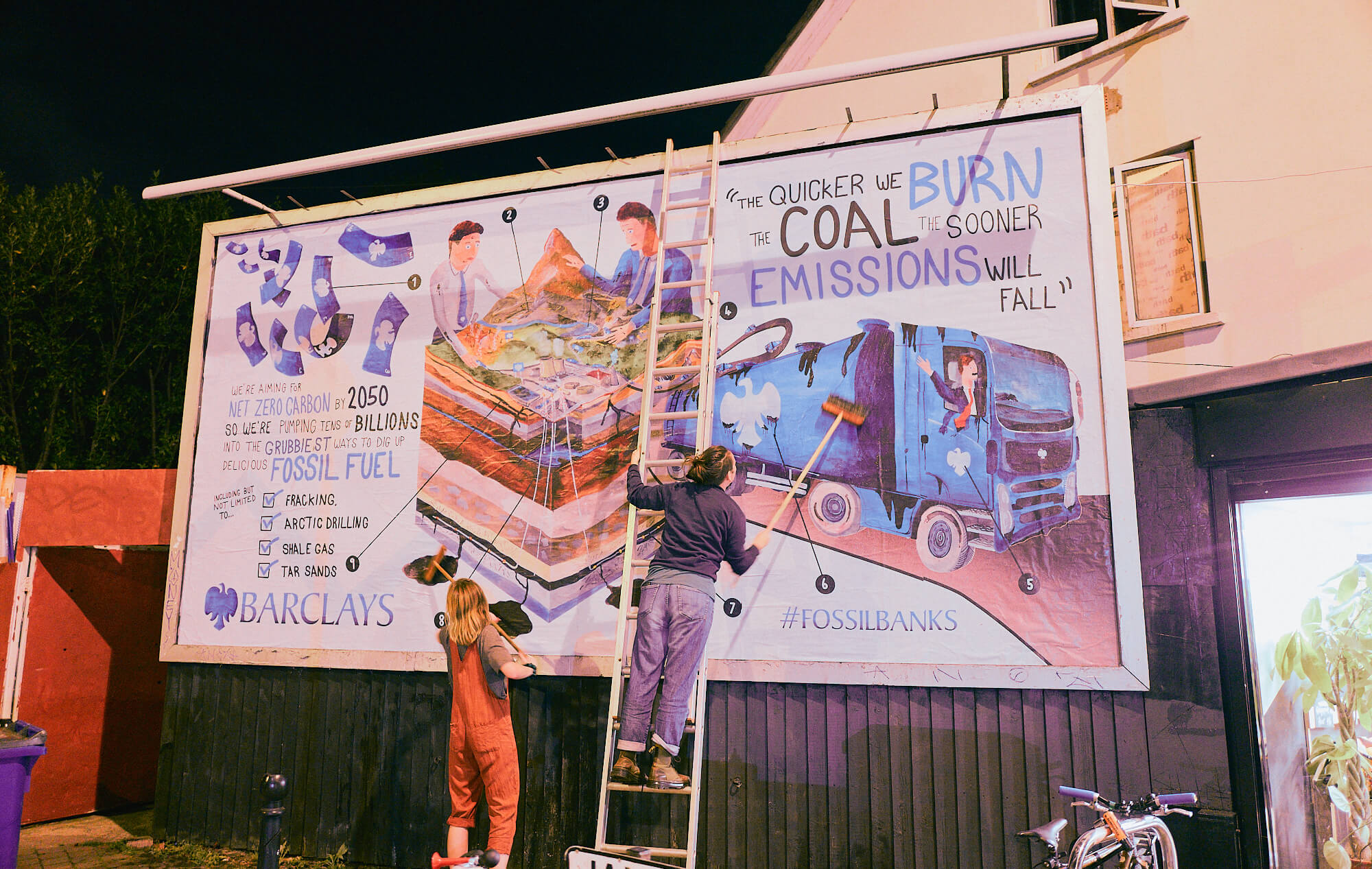 Support independent eco journalism that drives real change.The posters designed by 11 artists reference Barclays financing of companies involved in Arctic oil drilling, coal mining and fracking as well industrial meat companies such as JBS, who are accused of deforestation in the Amazon. They also link the bank's sponsorship of the football Premier League with fossil fuel profits. One billboard artwork by Darren Cullen reads, “Our plans to stop forest fires: cut them down first.” Another by Inzione shows an Arctic oil rig and reads, “Drilling our way to Net Zero.”