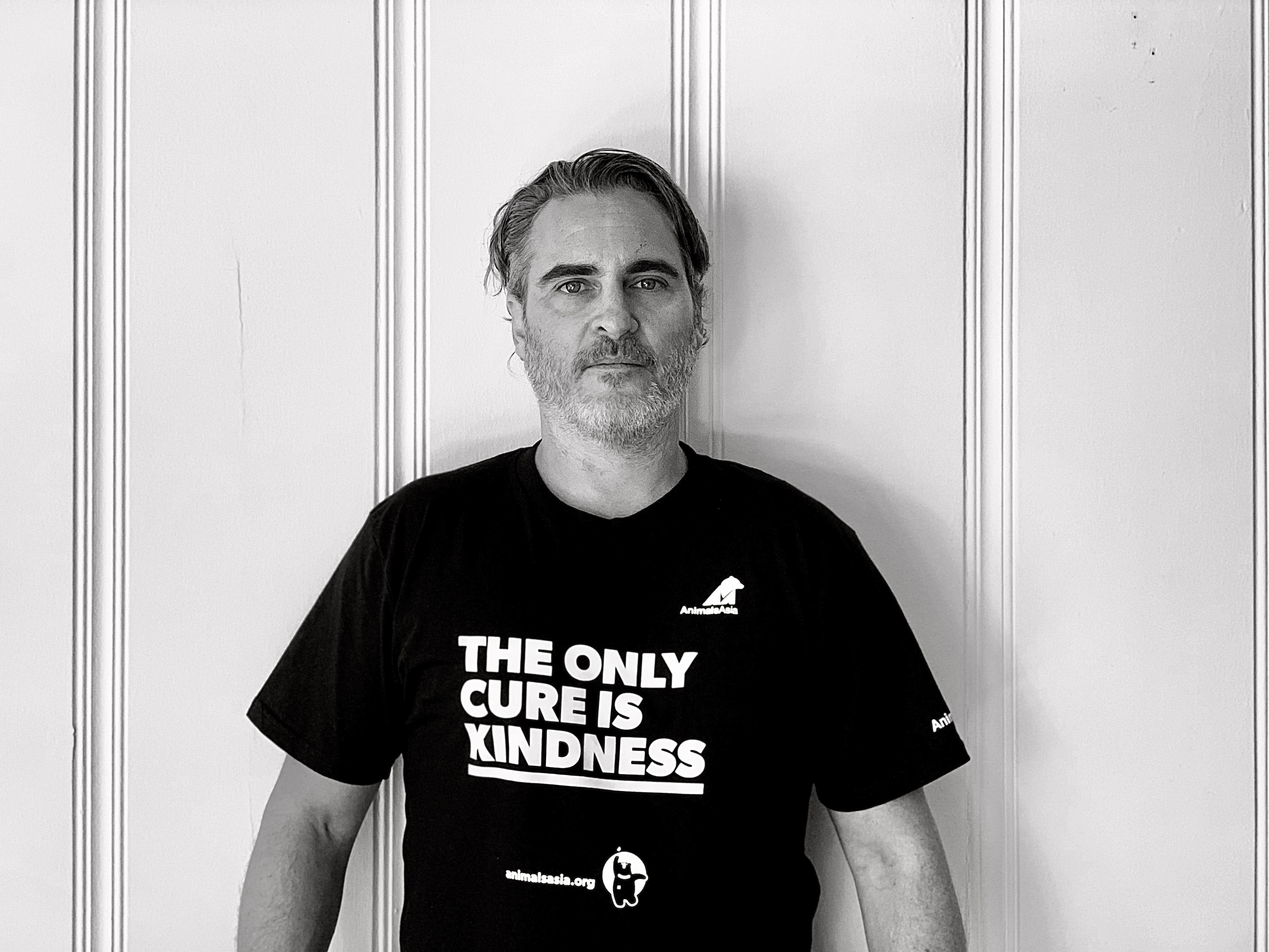 Joaquin Phoenix wearing a t-shirt bearing the words “The Only Cure is Kindness”.
