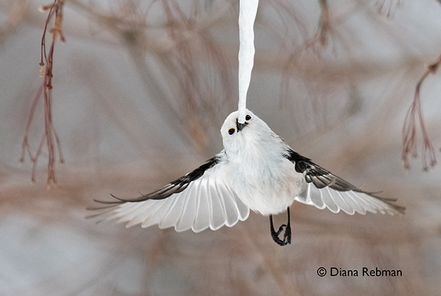 Long-tailed tit in Hokkaido, where winters are freezing and birds must nibble on snow and ice for water. Credit Diana Rebman