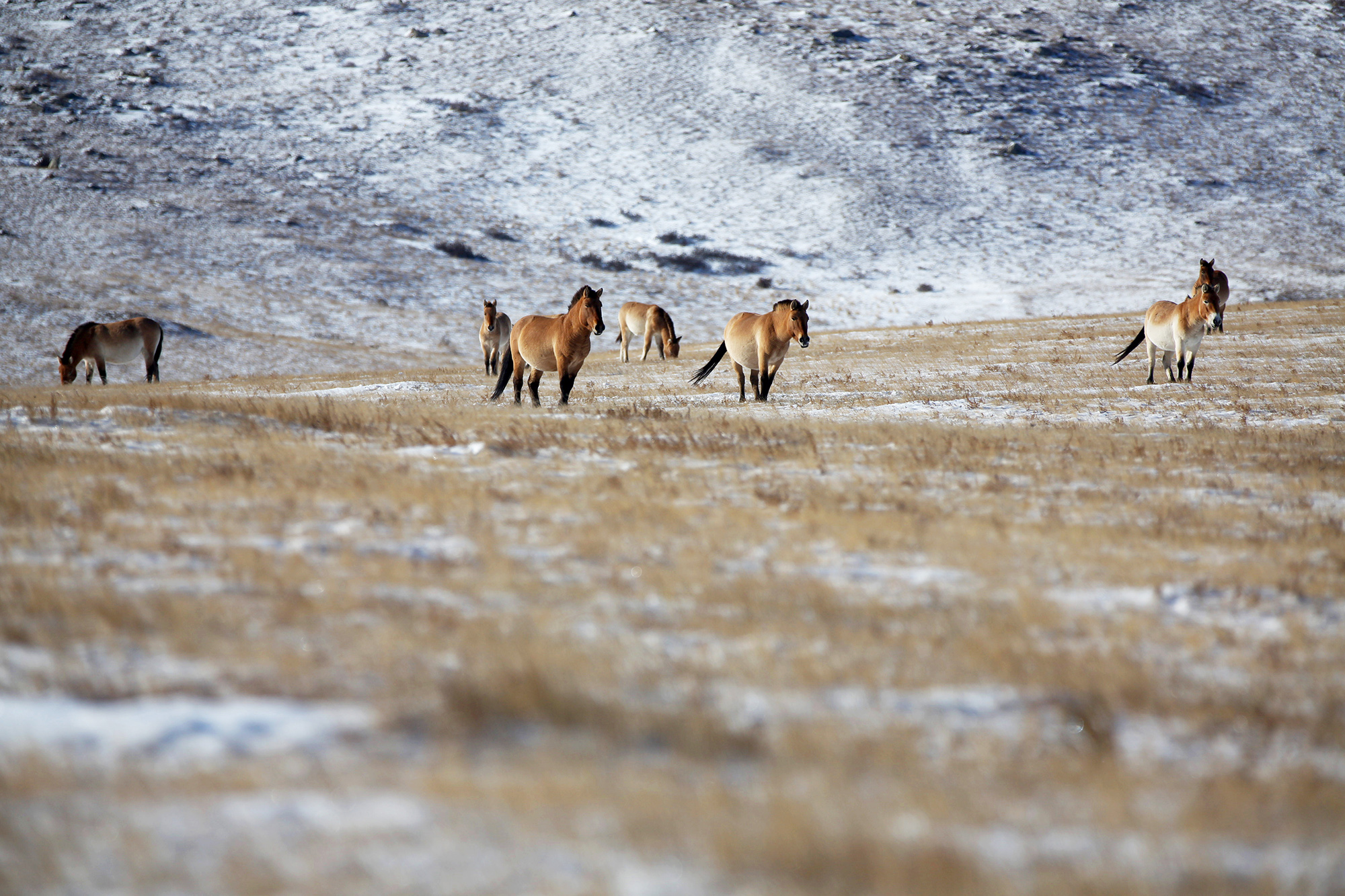 A herd of beautiful Przewalski’s horses, cavorting in the Hustai National Park, central Mongolia. Credit Sean Gallagher