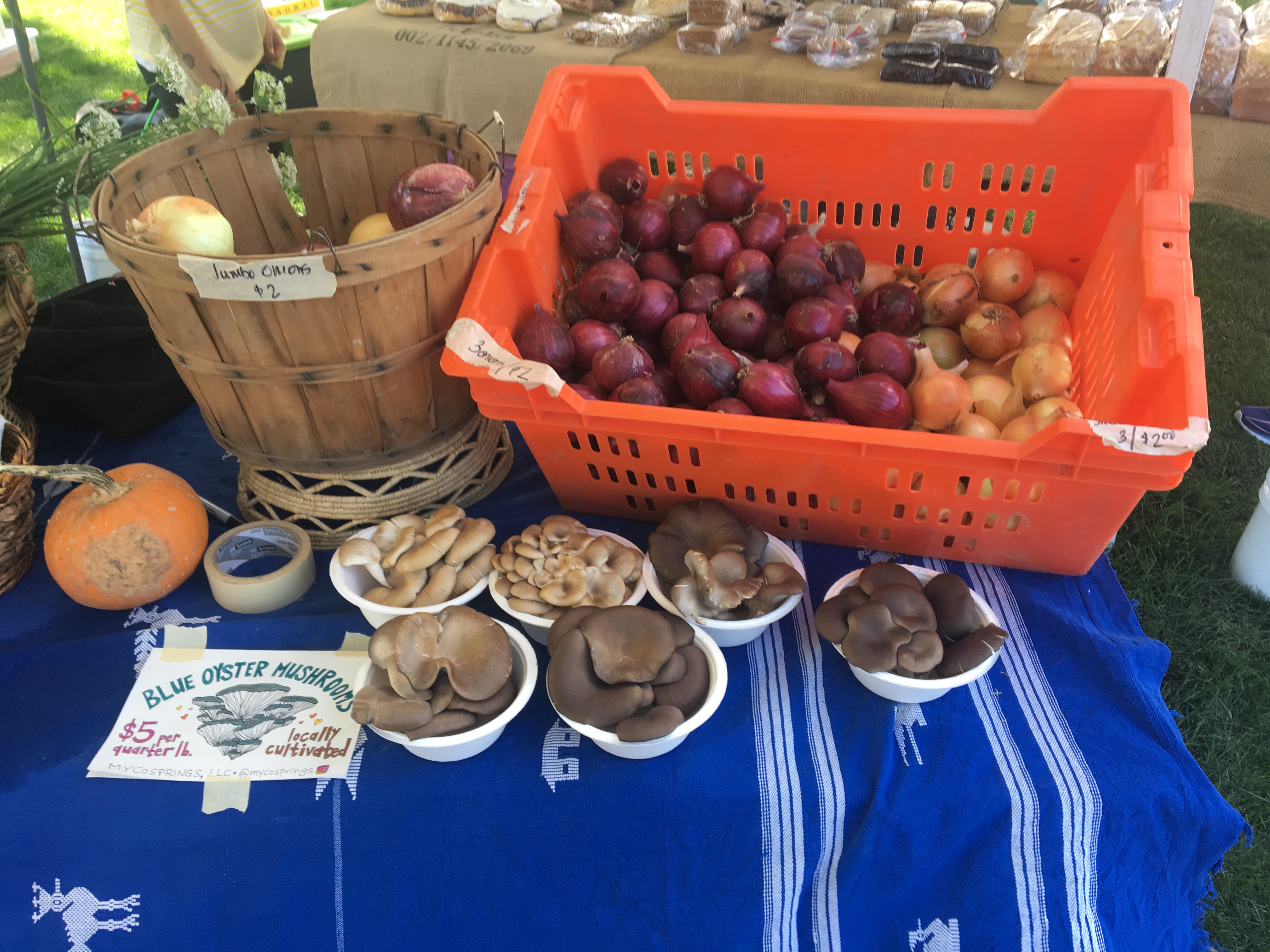 Grey oyster mushrooms for sale at a Colorado Springs summer farmer's market. The mushrooms were grown and sold by MycoSprings, a small landscaping company that incorporates fungi into their projects, offering enhanced plant and soil health, along with the bonus of delicious mushrooms like these, which can be picked, eaten or sold.