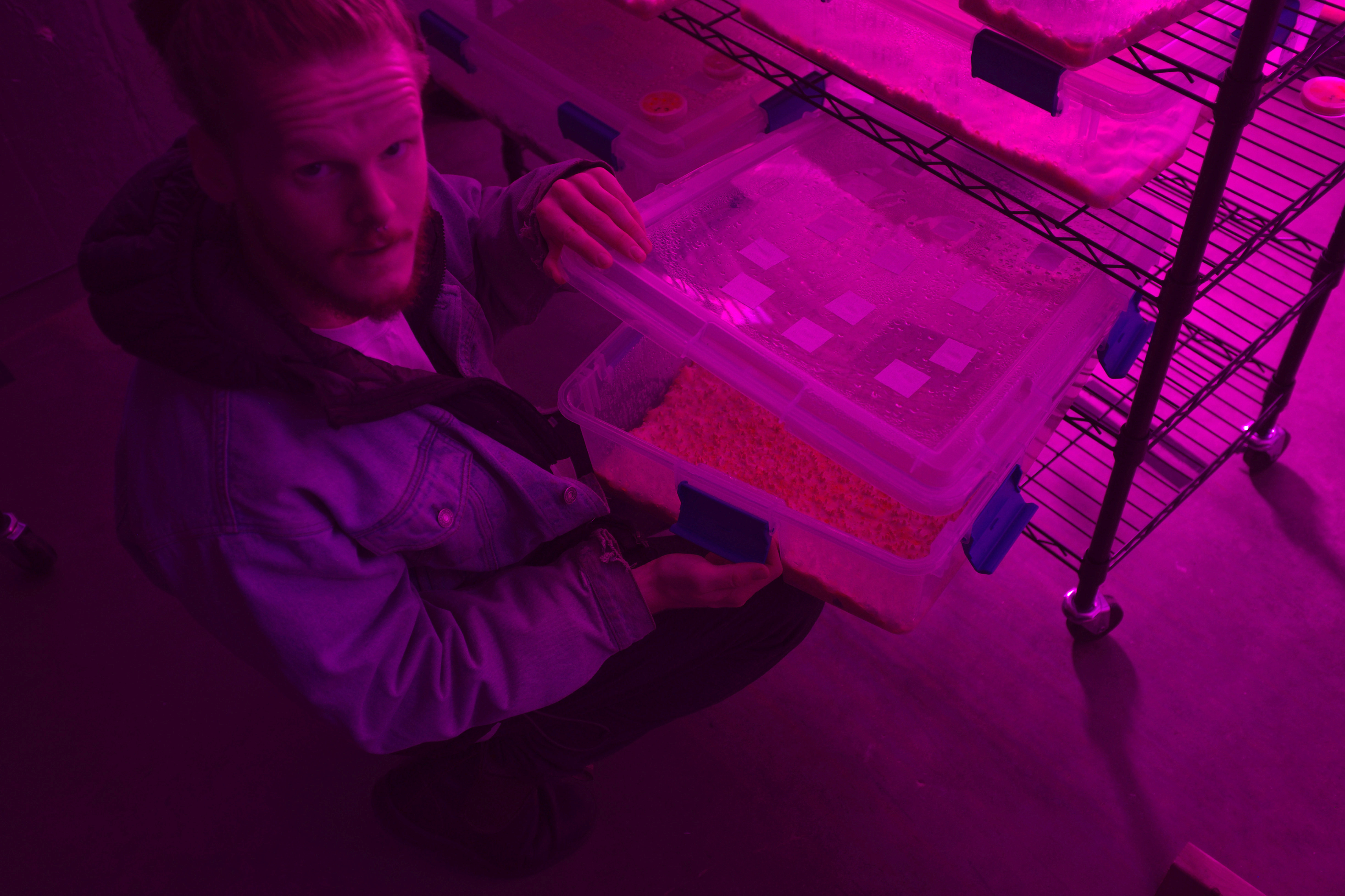 Alex Dorr, co-founder of Mushroom Revival shows off the many 'pins' of Cordyceps mushrooms beginning to grow in multi-spectrum light in their former Western Massachusetts production facility. Now based in Austin, they are perhaps the largest commercial cultivator of Cordyceps fungi in the United States, producing a line of tinctures and other fungi-infused products.