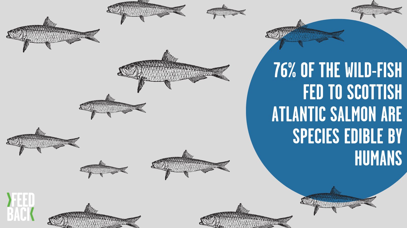 Feedback’s research shows that the production of 179,000 tonnes of Scottish Atlantic salmon requires 460,000 tonnes of wild-caught fish for feed, equal to the amount of fish consumed by the UK population every year. 76% of these feed fish are human-edible. This represents an inefficient use of nutritious wild fish and has disastrous impacts on food insecure countries, which supply most of the fish used by the global feed industry. Fish farming also has significant environmental impacts: a review commissioned by the Scottish Parliament of the Scottish salmon industry listed a range of issues including sea lice, disease, waste, impacts on wild salmon, and fish welfare.