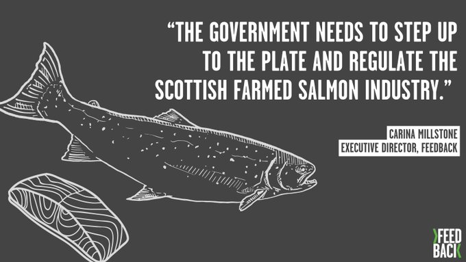 Carina Millstone, Executive Director of Feedback, said: The government needs to step up to the plate and regulate the Scottish farmed salmon industry. If it is serious about delivering “world-class sustainable fisheries and aquaculture management”, it can no longer allow this industry to go unchecked as it gobbles up vast quantities of precious wild fish.