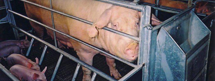 Following this the mother pigs are locked up in farrowing crates. They cannot move but they can gnaw at a bar in front of them to vent the agonising frustration that must set in as the slow days grind by. Wild pigs can live to be 10–14 years old. A breeding sow on a factory farm will be killed at around three years after their peak productivity fades after being repeatedly ravaged producing six litters, back to back, without a break.