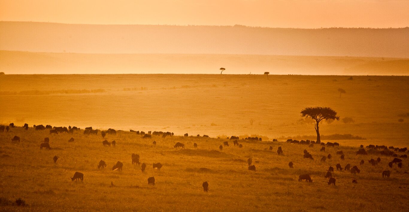 Wildebeest at sunset in the Maasai Mara. The recovery of Wildebeest numbers has helped turn the Serengeti ecosystem from a carbon source into a carbon sink (Photo by Robin Moore/Re:wild)
