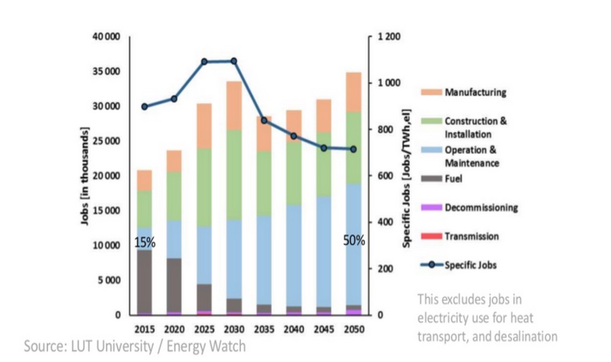 This is where the story for 100% renewable energy continues to get better. In 2015, the global power sector employed around 20 million people, with more than 70% in the fossil fuel sector. A 100% renewable power system will employ 35 million people, with solar PV emerging as the major job creating industry, employing more than 22 million by 2050. The c. nine million jobs in the global coal industry in 2015 will be reduced to nearly zero by 2050 and will be overcompensated by more than 15 million new jobs in the renewable energy sector.
