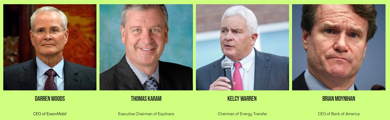 Kelcy Warren is the billionaire chairman of Energy Transfer, the company behind the Dakota Access Pipeline, and Trump mega-donor. He has been identified as a climate criminal for his company’s ecologically destructive pipelines and dangerous hazardous spills, filing SLAPP lawsuits against environmental groups and anti-pipeline protestors in attempts to silence opposition, and hiring a military contractor to infiltrate groups of peaceful protestors. See his Climate Criminal profile HERE .