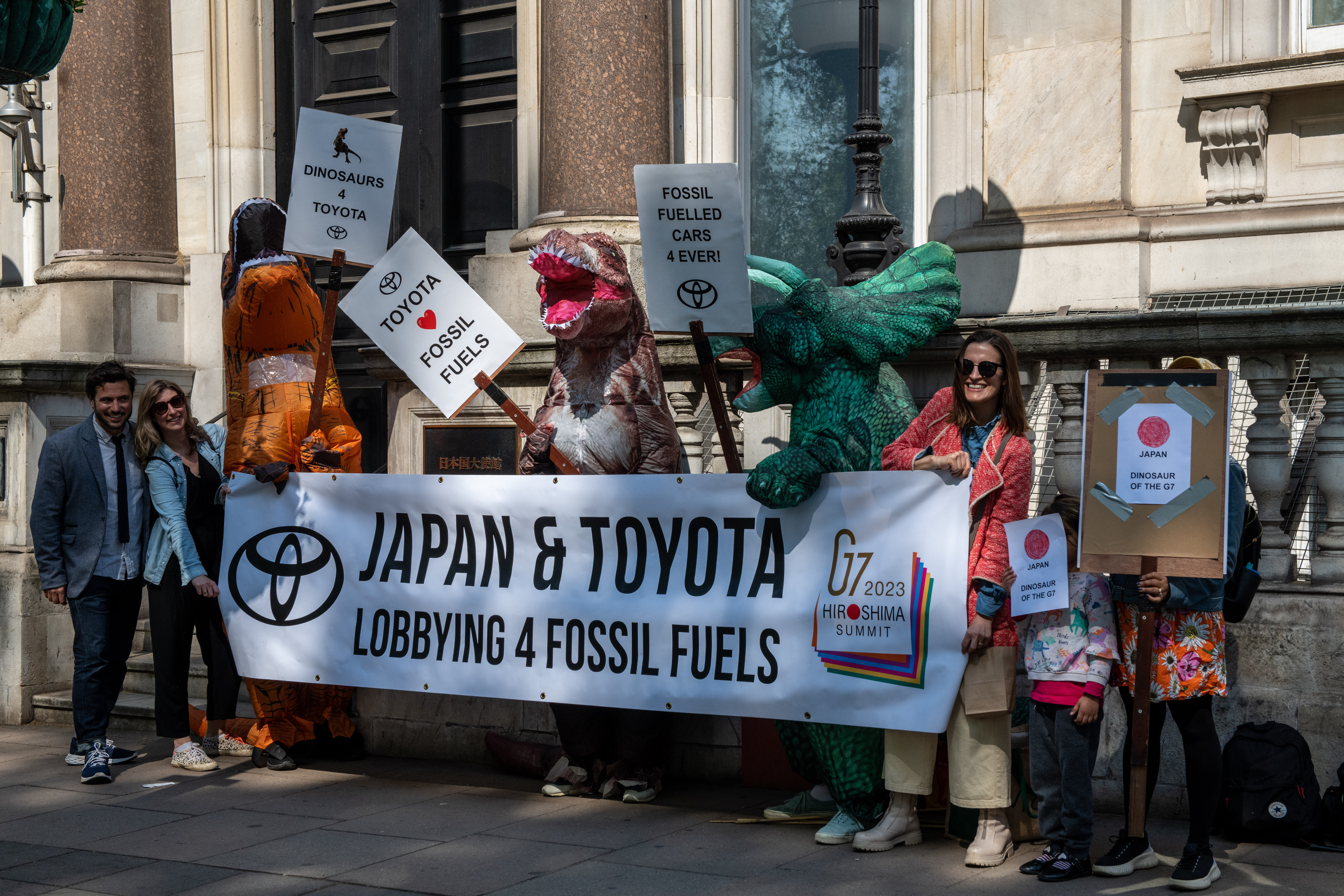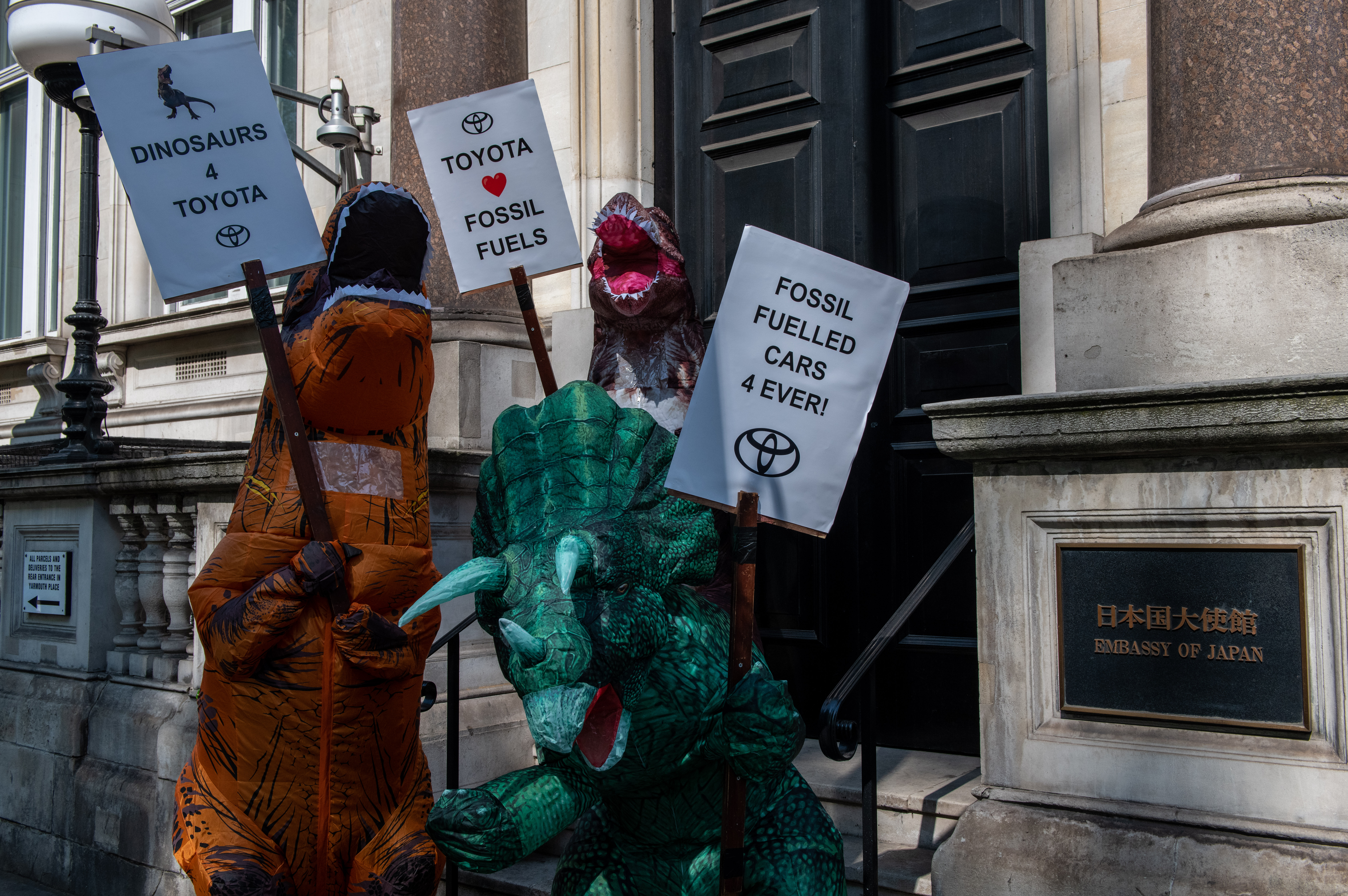 Three dinosaurs staged a protest in support of Toyota’s anti-climate lobbying and the toxic influence it is having on Japan in global climate negotiations.