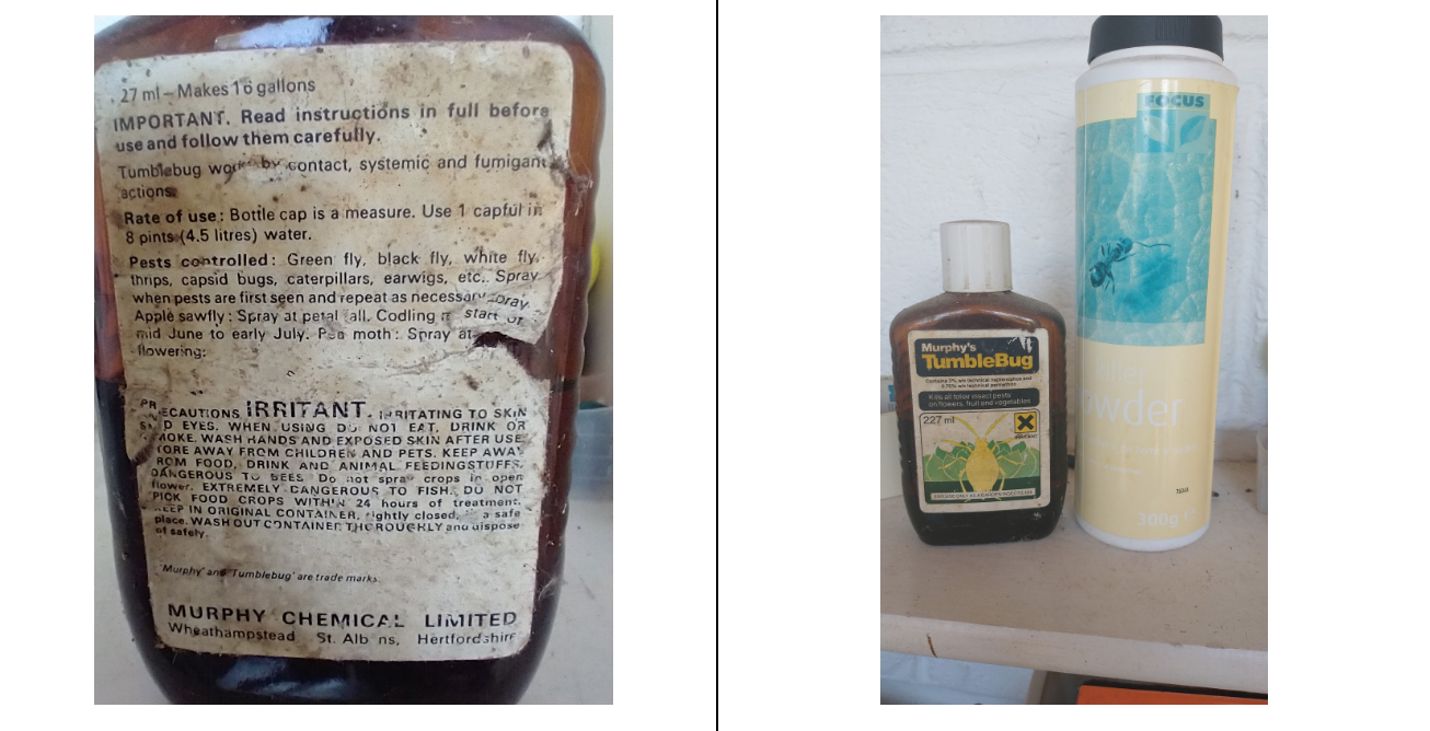 Aunty’s garage held a few surprises, including some old household pesticides of indeterminate age (Murphy’s Chemicals Limited no longer exists in the UK). TumbleBug contains two banned substances, heptenophos (an organophosphate ) and permethrin .