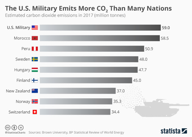 The Pentagon uses more petroleum per day than the aggregate consumption of 175 countries (out of 210 in the world), and generates more than 70 percent of the USA’s total greenhouse gas emissions, based on rankings in the CIA World Factbook. “The U.S. Air Force burns through 2.4 billion gallons of jet fuel a year, all of it derived from oil.”