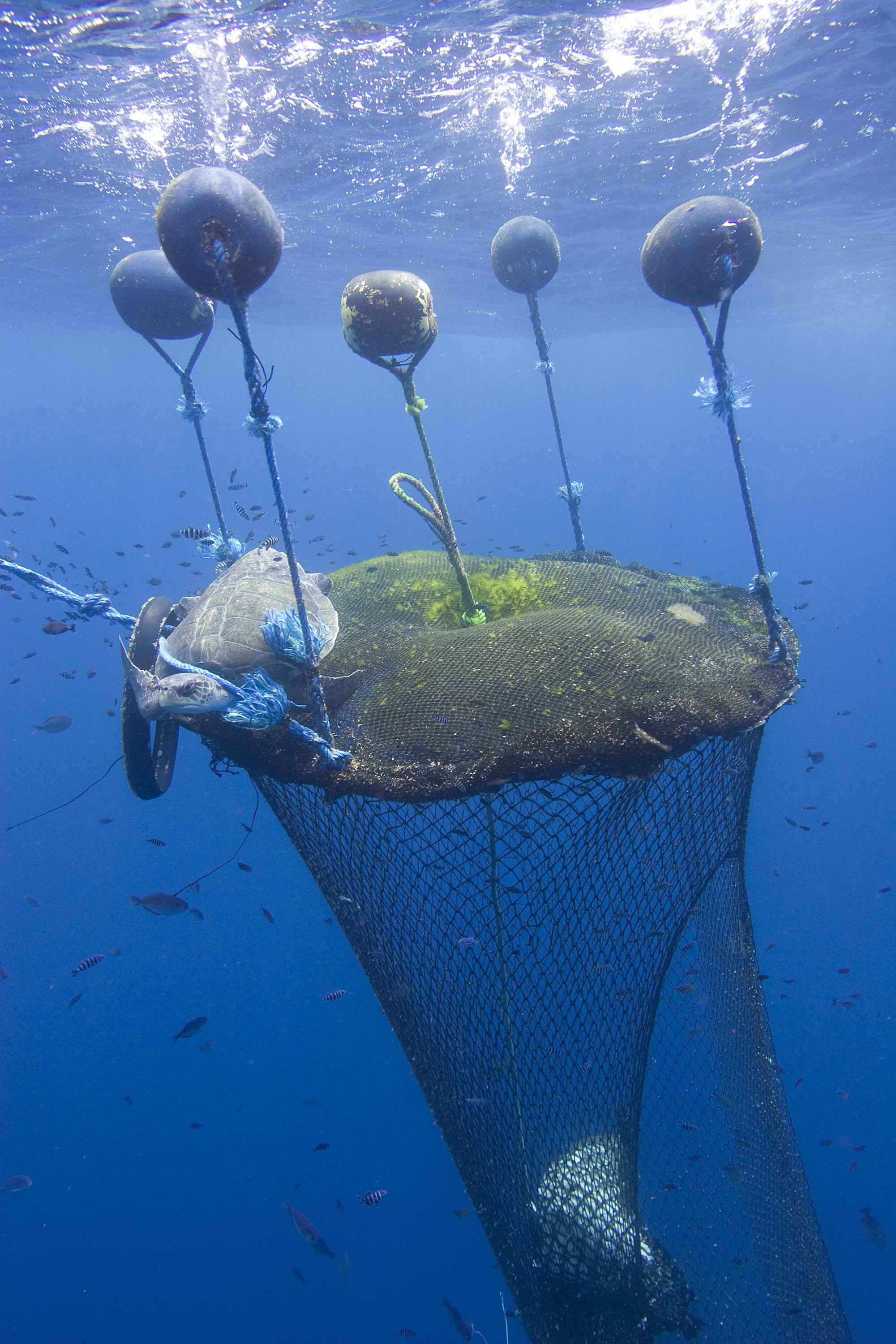A turtle trapped in a drifting Fish Aggregating Device (FAD) - used for tuna fishing - in the Pacific Ocean