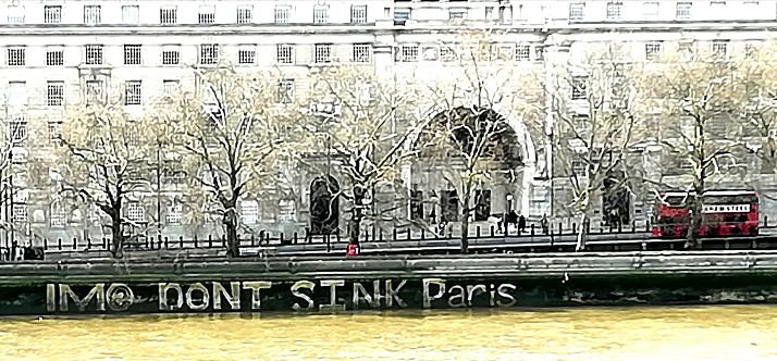 Giant message written previously on the bank of the Thames outside the IMO HQ, London