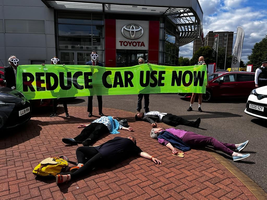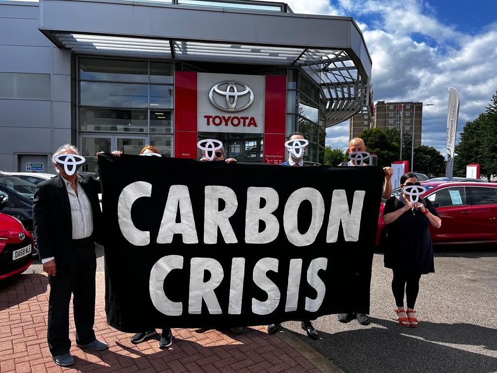 Roads Rebellion protested at the flagship Toyota showroom in London today to demand Toyota stop its dirty lobbying and align with climate science at its annual shareholders meeting this week.